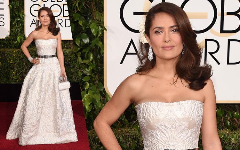 Selma Hayek, achei o vestido lindo, o tecido trabalhado e com um brilho mais discreto, corte clássico mais bonito, já o make e o cabelo estavam muito simples para um "red carpet", bem apagadinho e esta flor, acho que ela não destacou a maquiagem para não brigar com a tal flor, mas pra mim ela poderia ter tirado a flor e caprichado no make. Nada contra pregadeiras de flor, mas acho bonito em look praia, ou para um casamento com um penteado bacana, mas na ocasião nada ver!!!