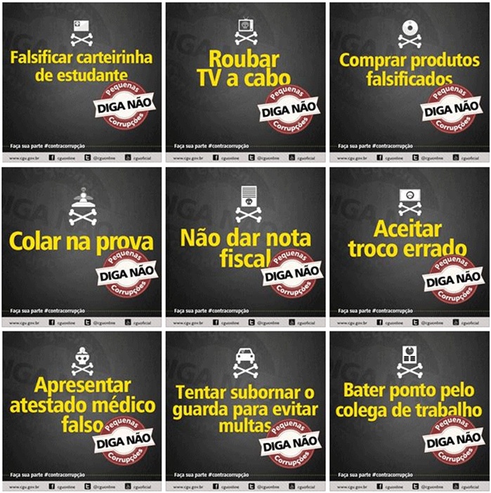 Meninas este não é um post que estamaos acostumadas a ver aqui no blog, mas pense nisso, tenha orgulho do seu país, pesquise coisas boas sobre ele e repasse aos outros.Faça sua parte e não deixe de dizer não à pequenas corrupções como estas na imagem acima, não é dificil andar na lei, e você só terá beneficíos, por exemplo, não comprar produtos piratas, há muitos produtos originais com bons preços, e você terá mais qualidade e segurança nos produtos, ande com seus documentos em dia, para não ser preciso subornar ninguém, estude para suas provas, enfim não seja corrupto, dê um bom exemplo aos seus filhos, e lembre-se que Deus é justo, e se for uma bom cidadão te recompensará. Perfeito ninguém é, mas podemos ser melhores!!!