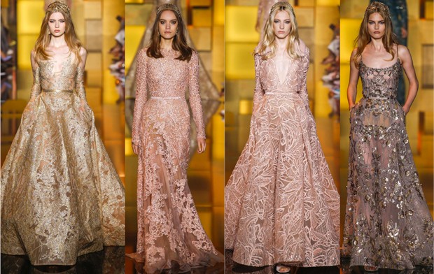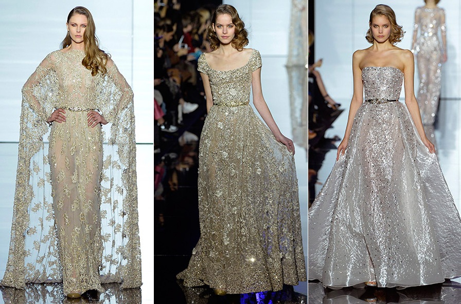 Olá meninas, há algumas semanas atrás rolou alguns desfiles de alta costura das marcas mais famosas, como Chanel, Versace, Zuhair Murad e outros. Só que hoje vou mostrar o meu preferido que é o Elie Saab, que além de ser um ótimo profissional é muito romântico com sua esposa, a Claudine, por quem fez uma homenagem no desfile apresentando um modelo de vestido de noiva todo dourado, como o que ele mesmo fez á 25 anos para o casamento deles, lindo não!!!