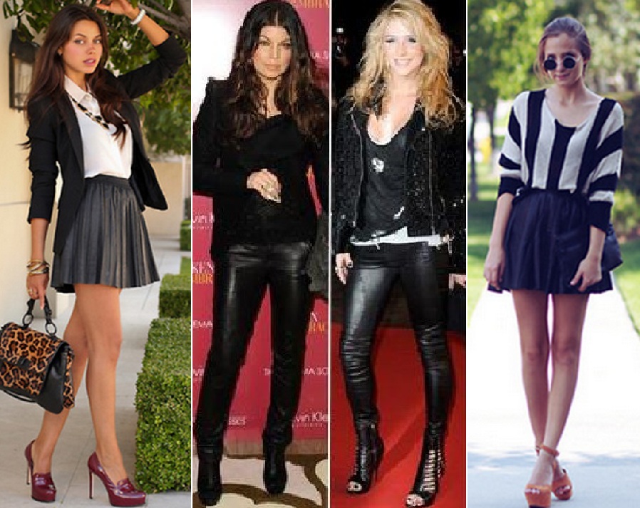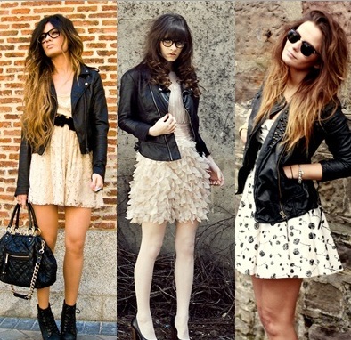 Couro fake - tenho uma certa resistencia com o couro por ser um tecido muito duro, prefiro tecidos mais macios e suaves, mas como é fake, dá pra encontrar alguns que atendam ao meu gosto. Sem contar que dá aquela pesada em looks muito delicados, o que eu curto, dá só uma olhada como fica lindo as jaquetas com vestidos bem femininos, e as saias rodadas, looks lindoooos!!!